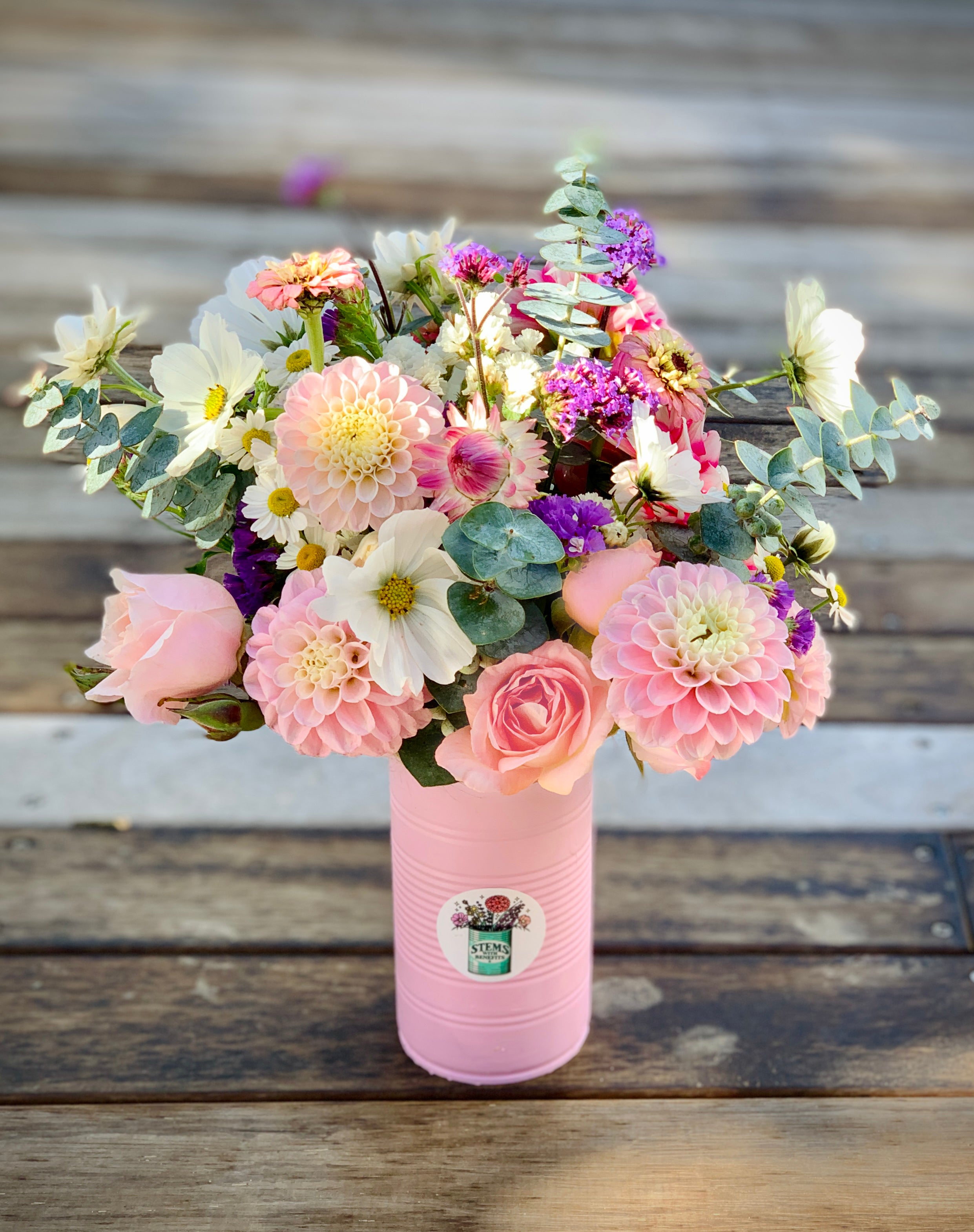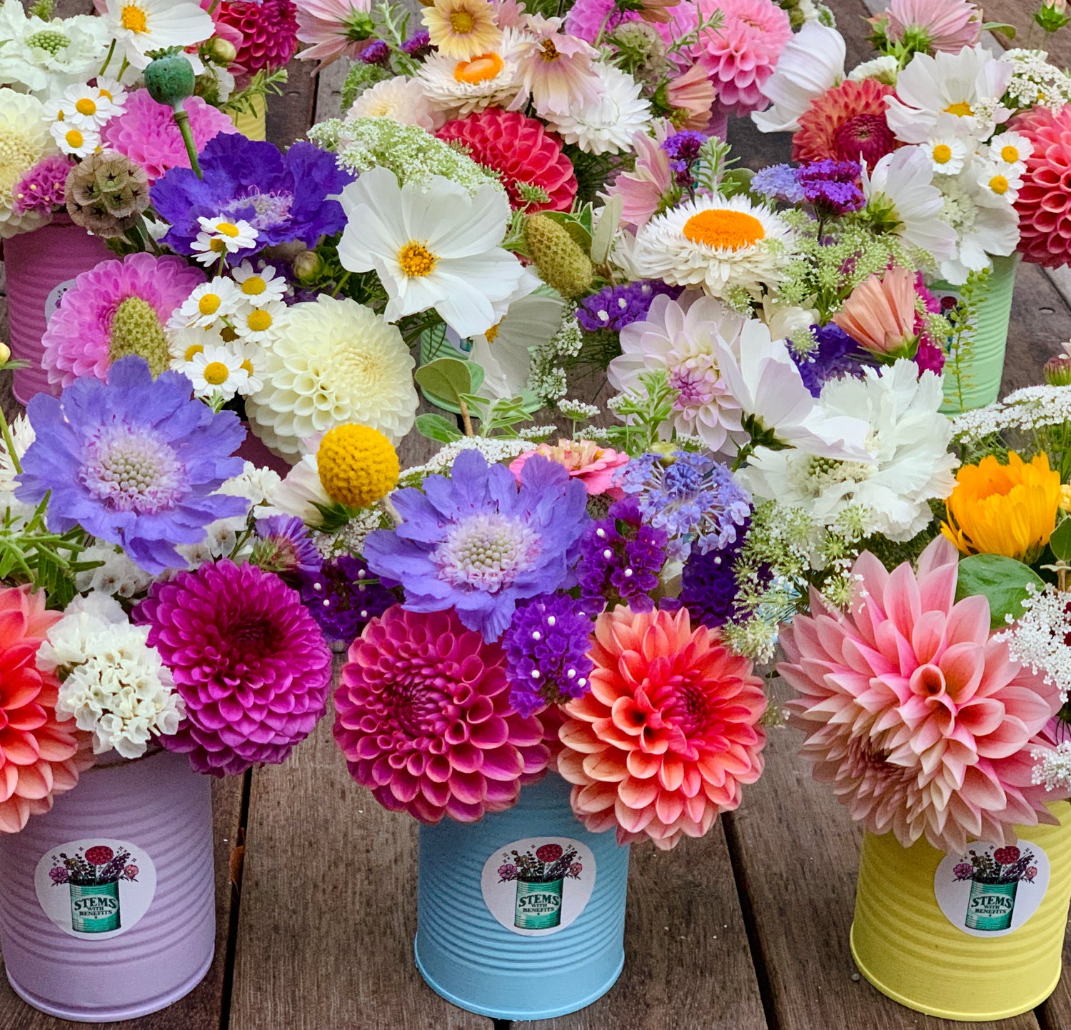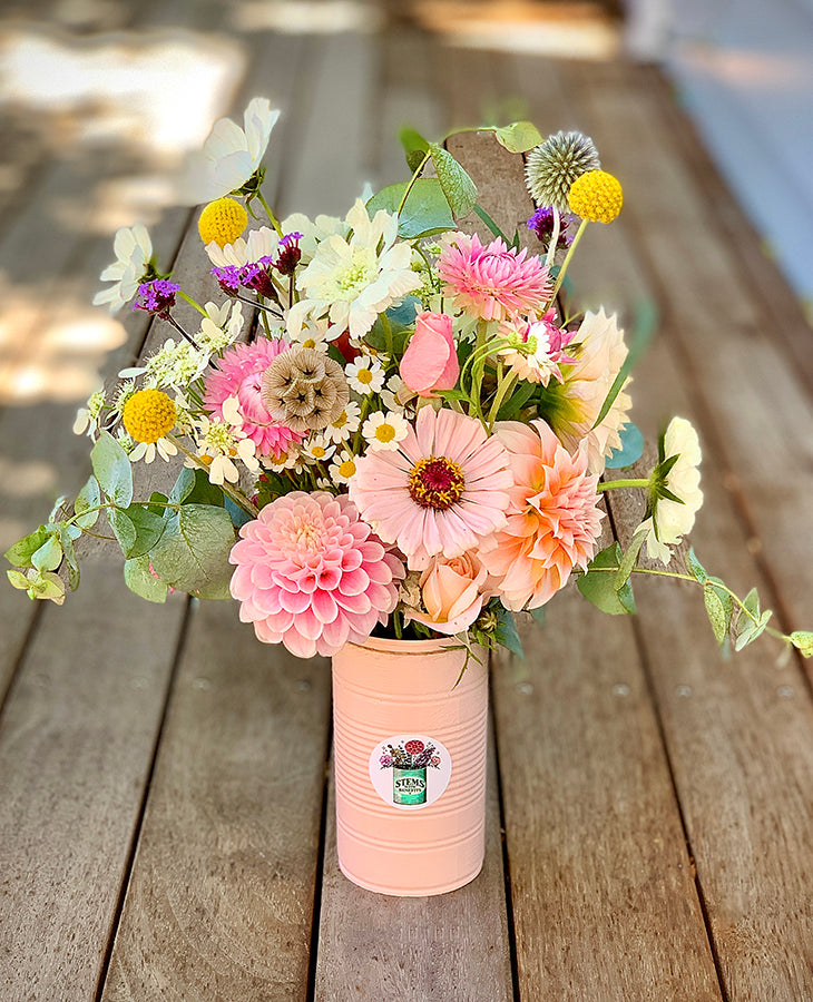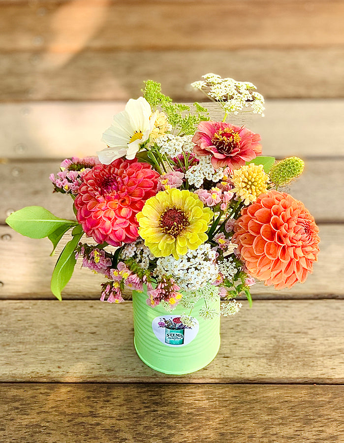 Blooms vary with the seasons – no two tins are exactly the same, but each is thoughtfully filled with what’s fresh, locally grown and in bloom that week.